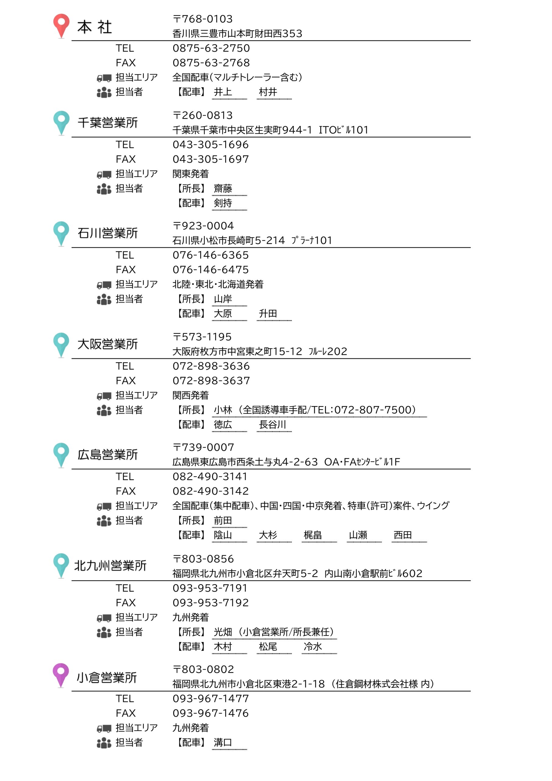 PROJECT 《 各営業所担当者および担当エリア一覧 》 誘導手配に関しては、大阪営業所が統括していますが、 各輸送案件とセットの場合は、各営業所担当者とご相談ください! ※約款については、コチラをご覧ください。